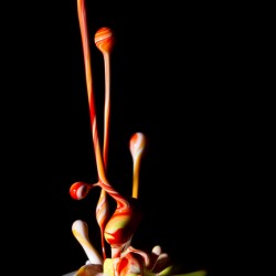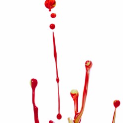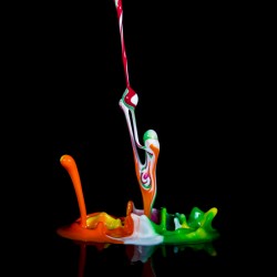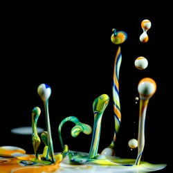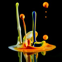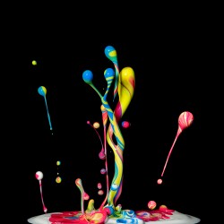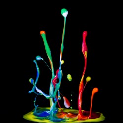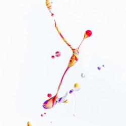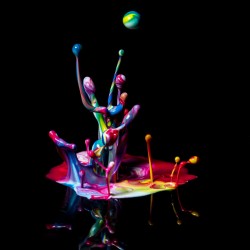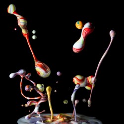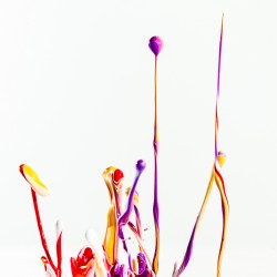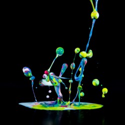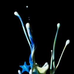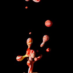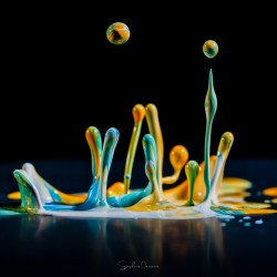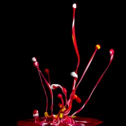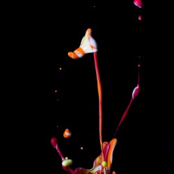 Ma collection « Gouttes Explosives » est une réalisation Photographique. Il n’y a aucun montage. Un savant mélange de peinture à l’eau déposé sur une membrane nous donne la matière. Le secret ici est de donner vie à cette matière et de la mettre en mouvement. Pour cela, je m’inspire de phénomènes physiques comme les tremblements de terre.